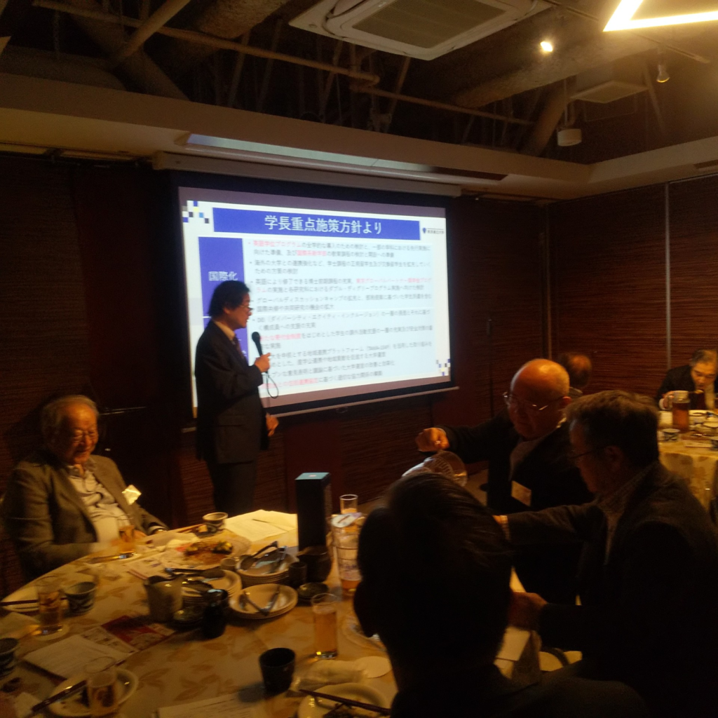 当日は大学から大橋隆哉学長、同窓会から奥田修一副会長がおいでくださり、それぞれ大学・同窓会の現状についてお話がありました。とくに大橋学長のお話はスライドを使ってとても詳しいご説明でした。